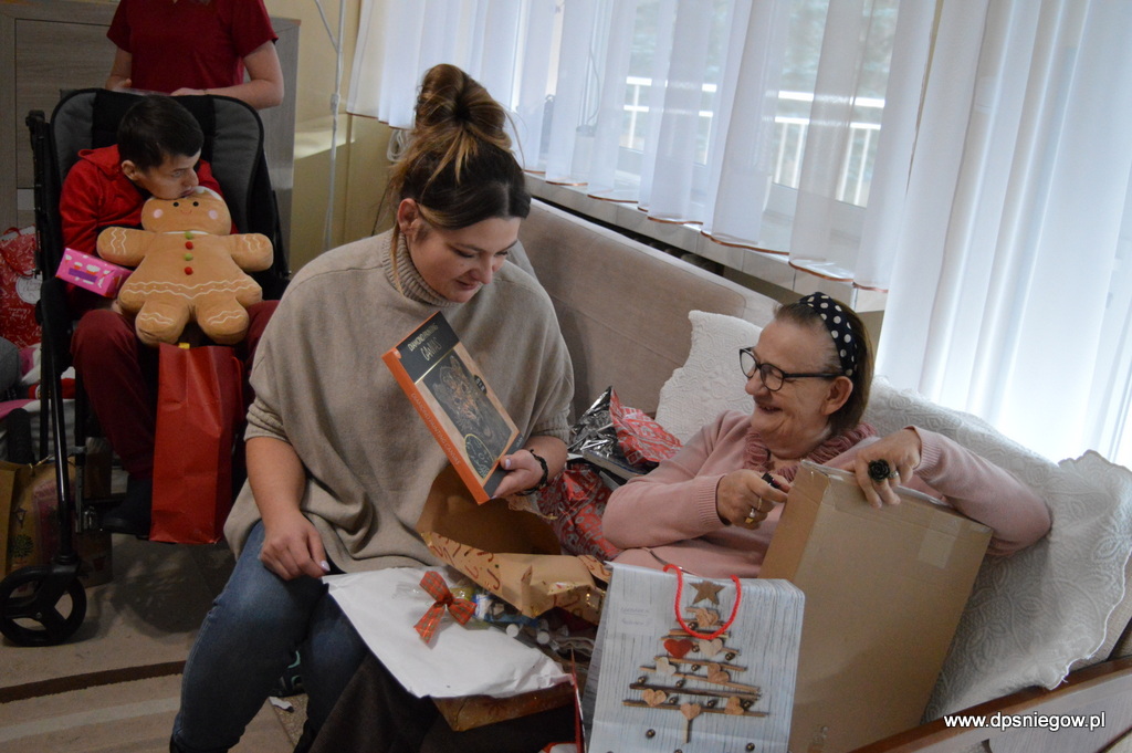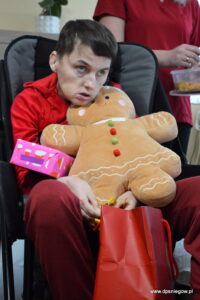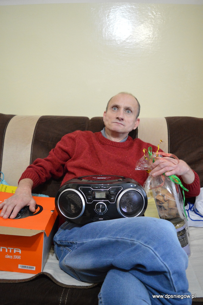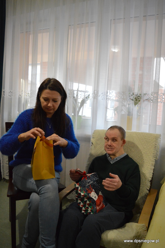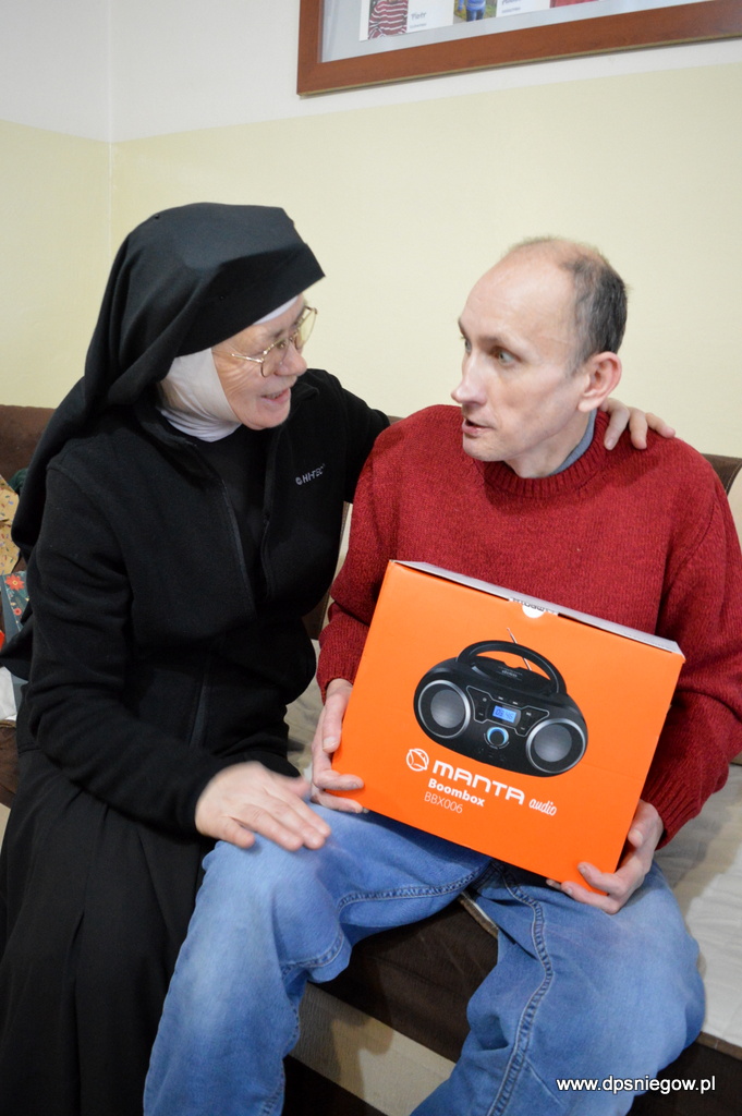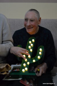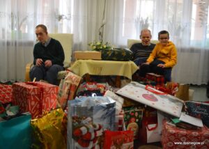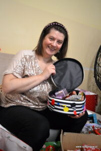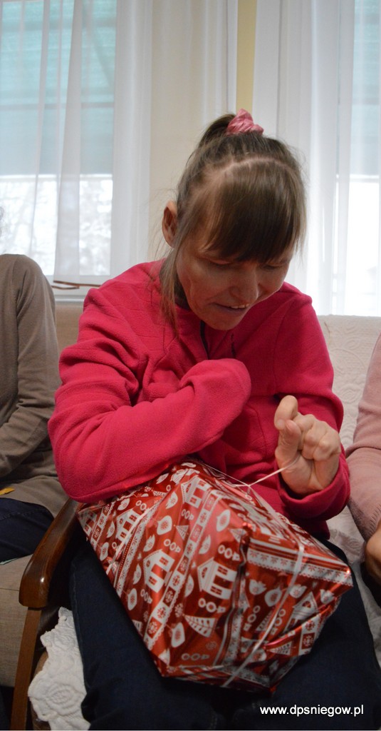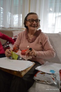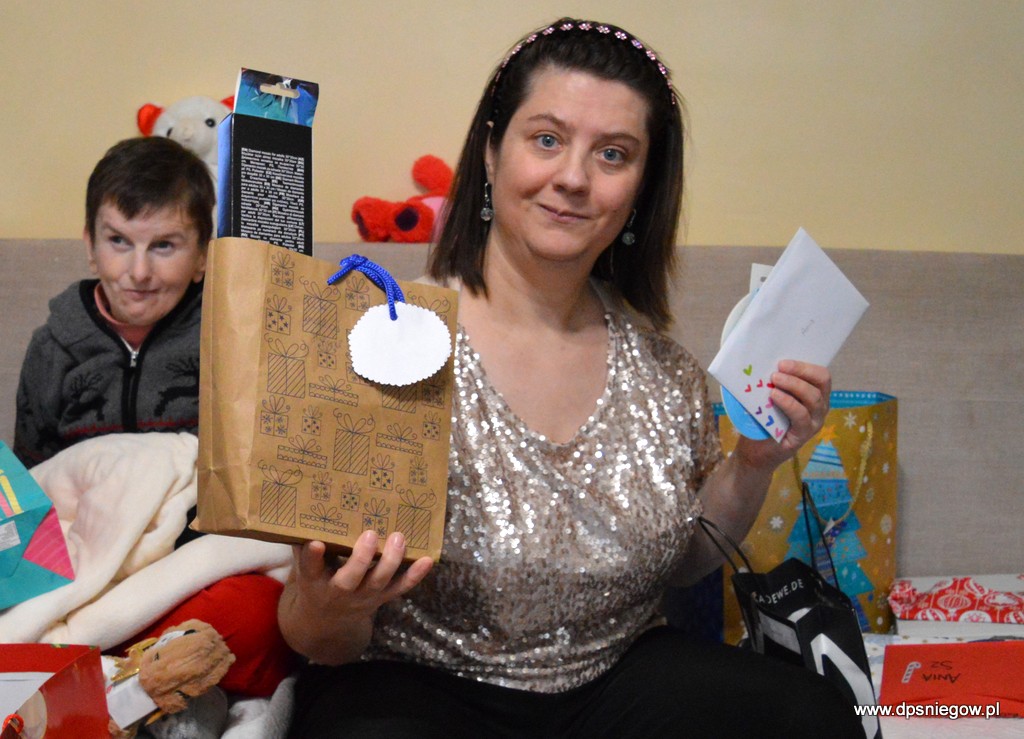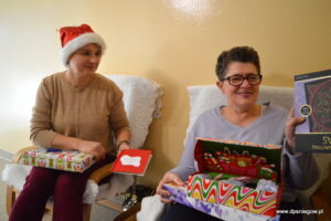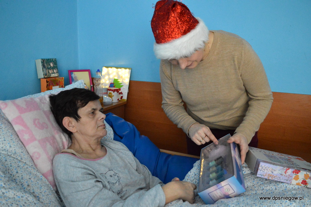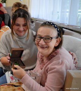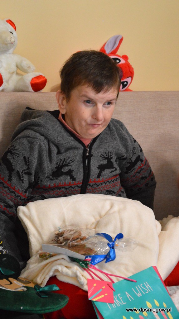 Na deser została nam Rodzinka IV. Nasze Panie nosy przylepiały do szyb wypatrując, kiedy do nich dotrzemy. Udało się. Nasze Elfy rozdawały prezenty i pomagały otwierać. Nasz Basia zachwycona biżuterią – wszystkie bransoletki nałożyła na jedna rękę; trochę się tego uzbierało… Ania uradowana kosmetykami; Kocyki i milusie poduchy dla przytulanek. Dziękujemy, dziękujemy. Wasza pamięć o naszych Mieszkańcach jest bardzo wzruszająca. Wszystkich życzeń jeszcze nie przeczytałyśmy ale przy kilku zakręciła mi się łza w oku…Dziękujemy również za wszelkie vouchery do kina czy do teatru. Jesteście WSPANIALI!