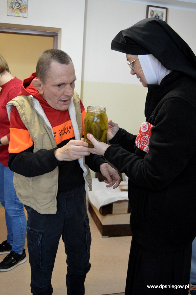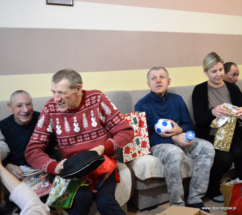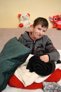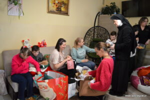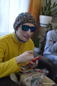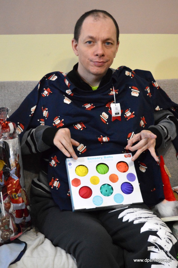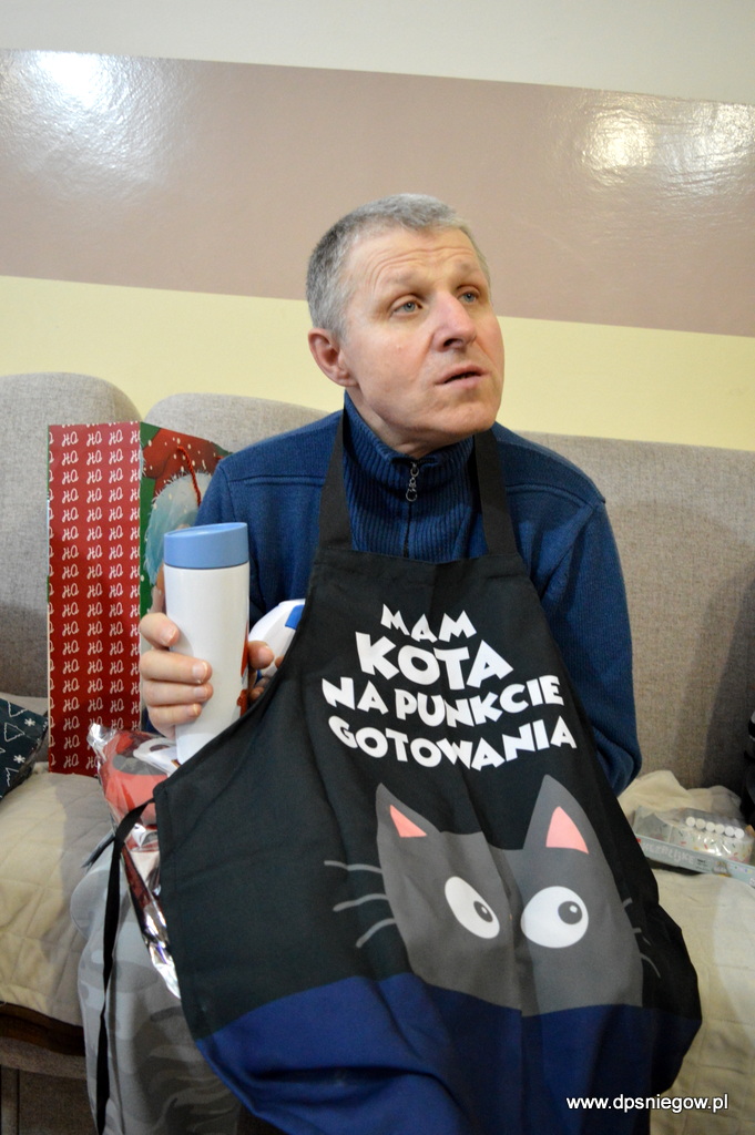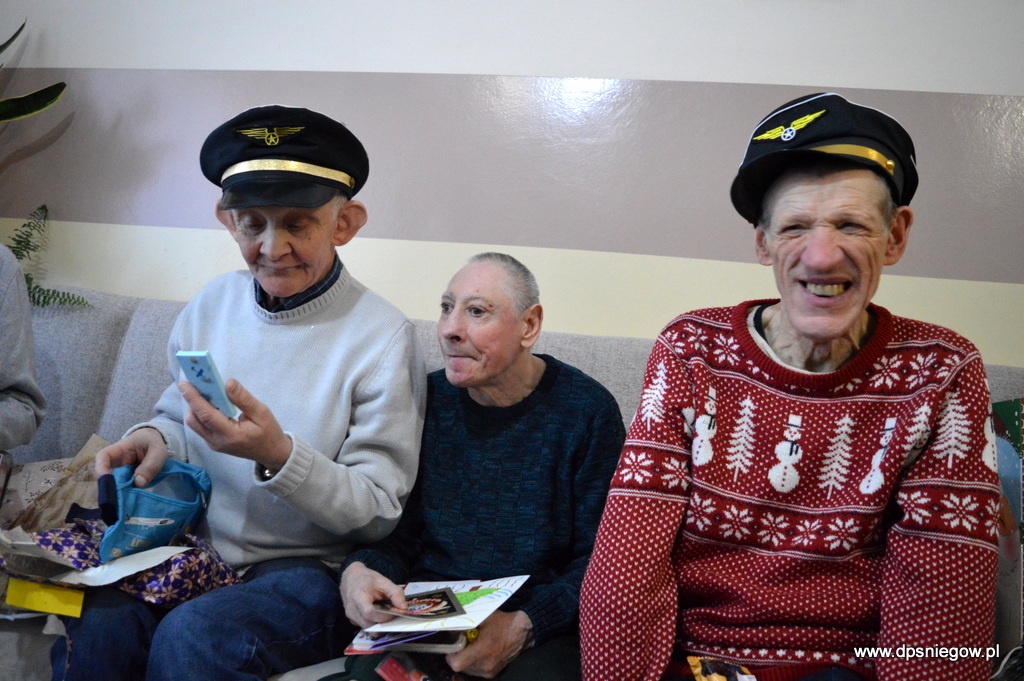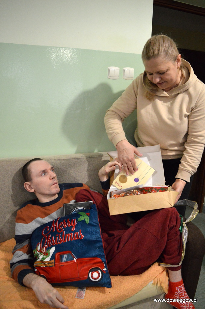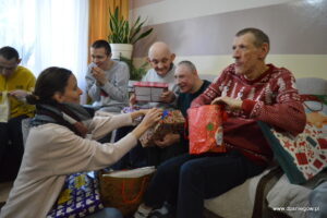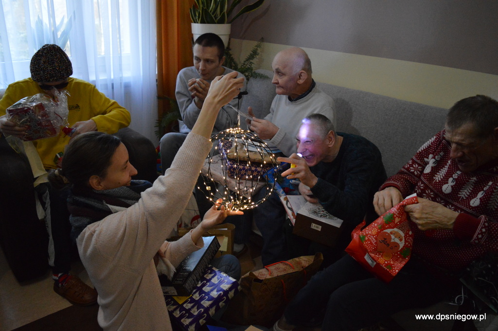 Na deser została nam Rodzinka IV. Nasze Panie nosy przylepiały do szyb wypatrując, kiedy do nich dotrzemy. Udało się. Nasze Elfy rozdawały prezenty i pomagały otwierać. Nasz Basia zachwycona biżuterią – wszystkie bransoletki nałożyła na jedna rękę; trochę się tego uzbierało… Ania uradowana kosmetykami; Kocyki i milusie poduchy dla przytulanek. Dziękujemy, dziękujemy. Wasza pamięć o naszych Mieszkańcach jest bardzo wzruszająca. Wszystkich życzeń jeszcze nie przeczytałyśmy ale przy kilku zakręciła mi się łza w oku…Dziękujemy również za wszelkie vouchery do kina czy do teatru. Jesteście WSPANIALI!